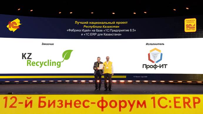 Лучшим региональным проектом внедрения на территории Республики Казахстан в конкурсе «1С:Проект года 2024» был признан проект «"Фабрика Идей" на базе "1С:Предприятие 8.5" и "1С:ERP для Казахстана"» в ТОО «KZ Recycling». В ходе проекта были выполнены все поставленные задачи и автоматизировано более 1000 рабочих мест партнером «1С» – группа компаний «Проф-ИТ».