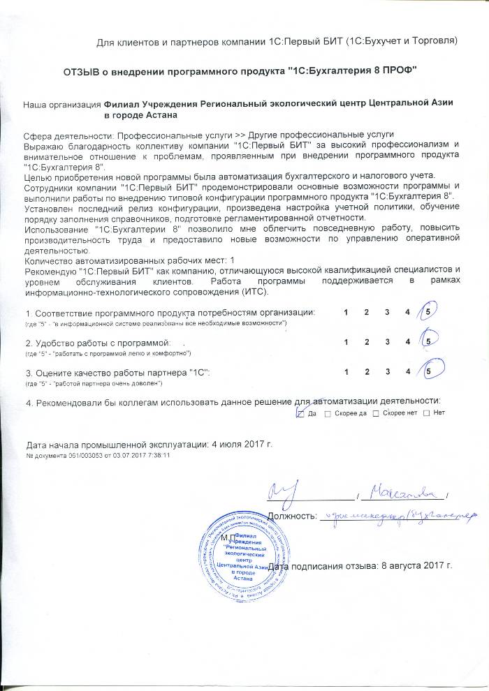 Клиент: Филиал Учреждения Региональный экологический центр Центральной Азии в городе Астана