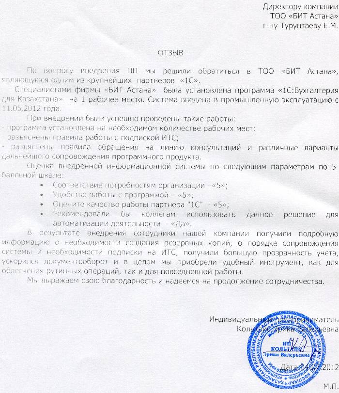 Внедренное решение: Автоматизация бухгалтерского учета у индивидуального предпринимателя Кольтайс Эрики Валерьевны на базе программного продукта "1С:Бухгалтерия 8 для Казахстана"