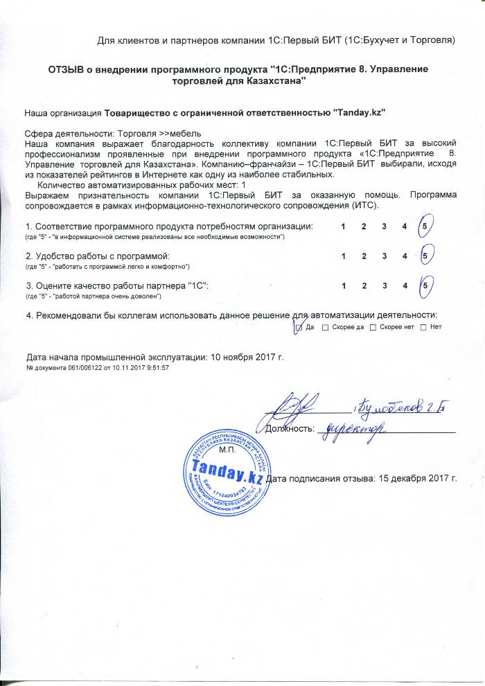 Внедренное решение: Автоматизация бухгалтерского учета на базе программного продукта "1С:Бухгалтерия 8 для Казахстана" в "Tanday.kz"