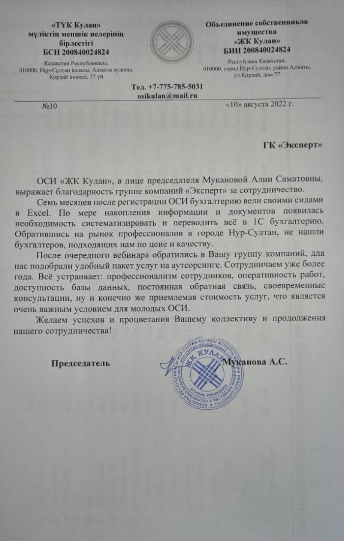 Внедренное решение: Внедрение "1С:Бухгалтерия 8 для Казахстана" в Объединение Собственников Имущества «ЖК Кулан»