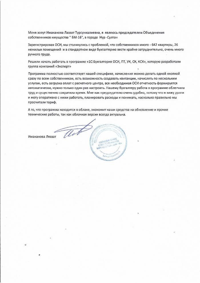 Внедренное решение: Внедрение "1С:Бухгалтерия 8 для Казахстана" в Объединение Собственников Имущества "БМ-16"