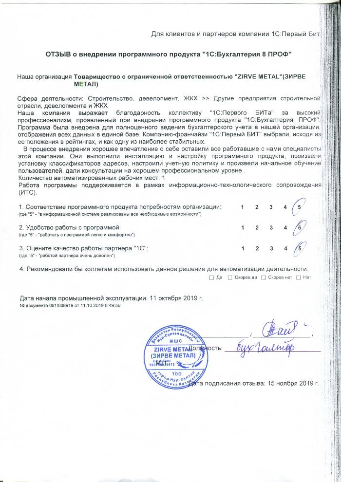 Внедренное решение: Автоматизация учета на базе "1С:Бухгалтерия 8 для Казахстана" в ТОО "ZIRVE METAL"