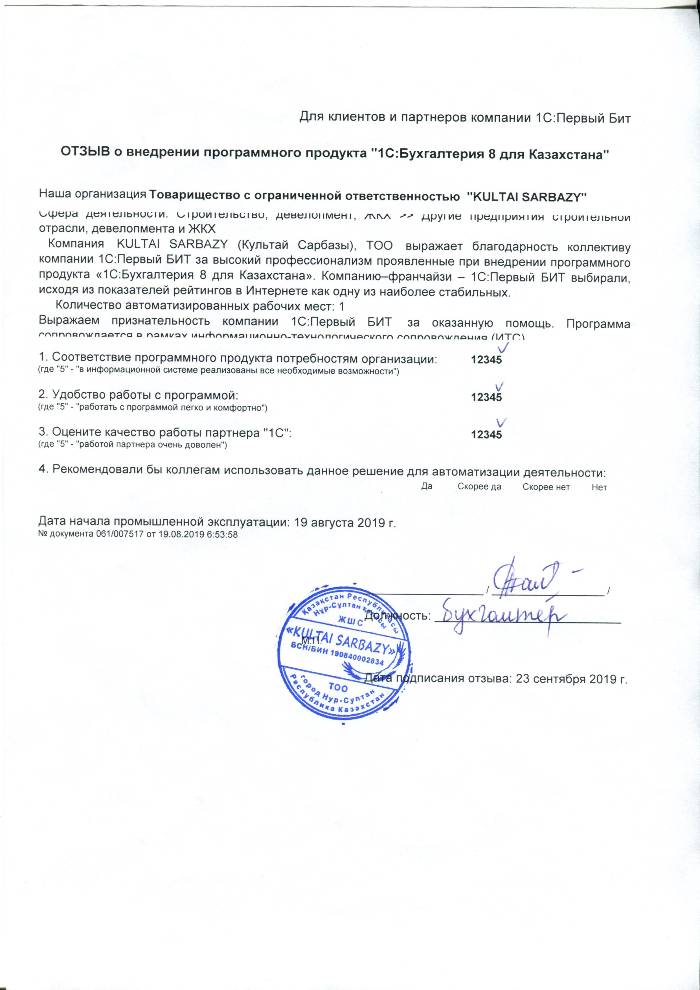 Внедренное решение: Автоматизация учета на базе "1С:Бухгалтерия 8 для Казахстана" в ТОО "KULTAI SARBAZY"