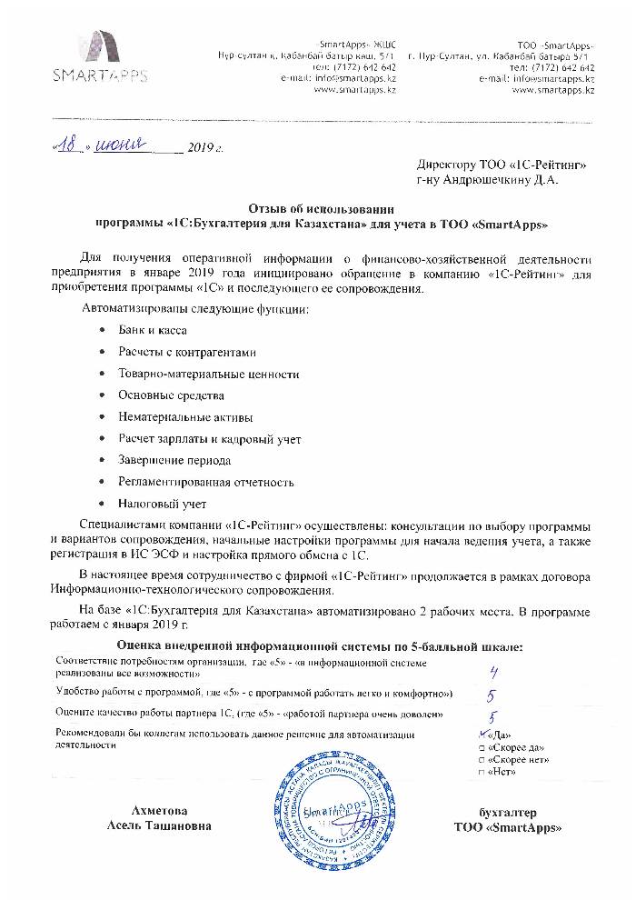 Внедренное решение: Внедрение "1C:Бухгалтерия 8 для Казахстана" в ТОО "SmartApps"
