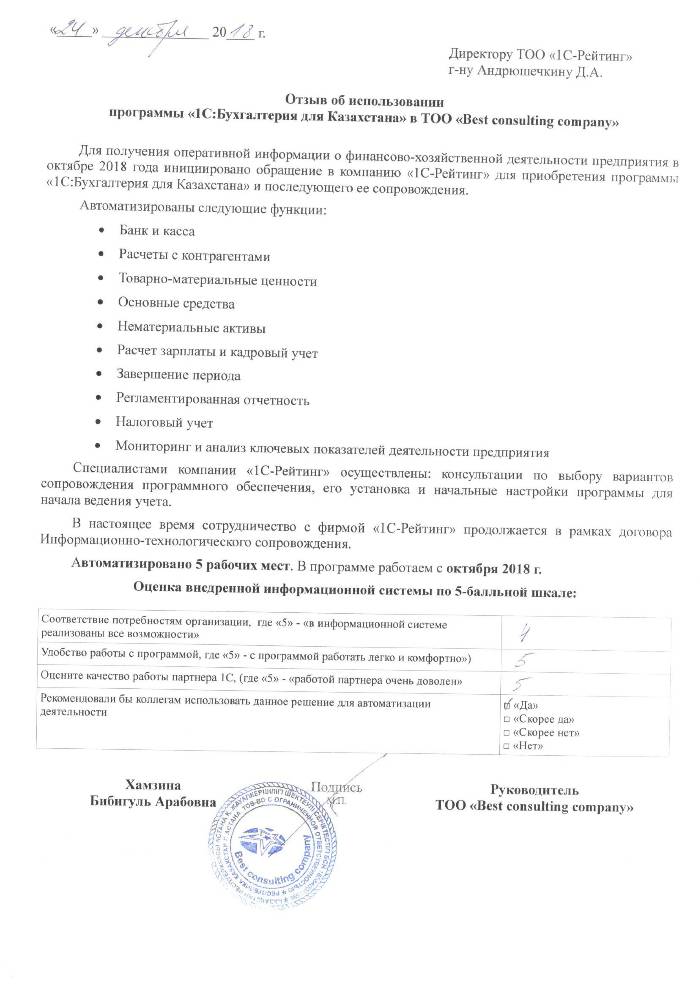 Внедренное решение: Внедрение "1С:Бухгалтерия 8 для Казахстана" в ТОО "Best consulting company"