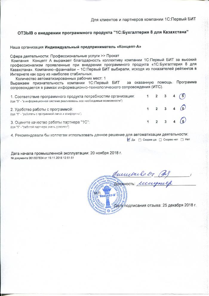 Внедренное решение: Автоматизация бухгалтерского учета на базе программного продукта "1С:Бухгалтерия 8 для Казахстана" у ИП «Концепт-А»