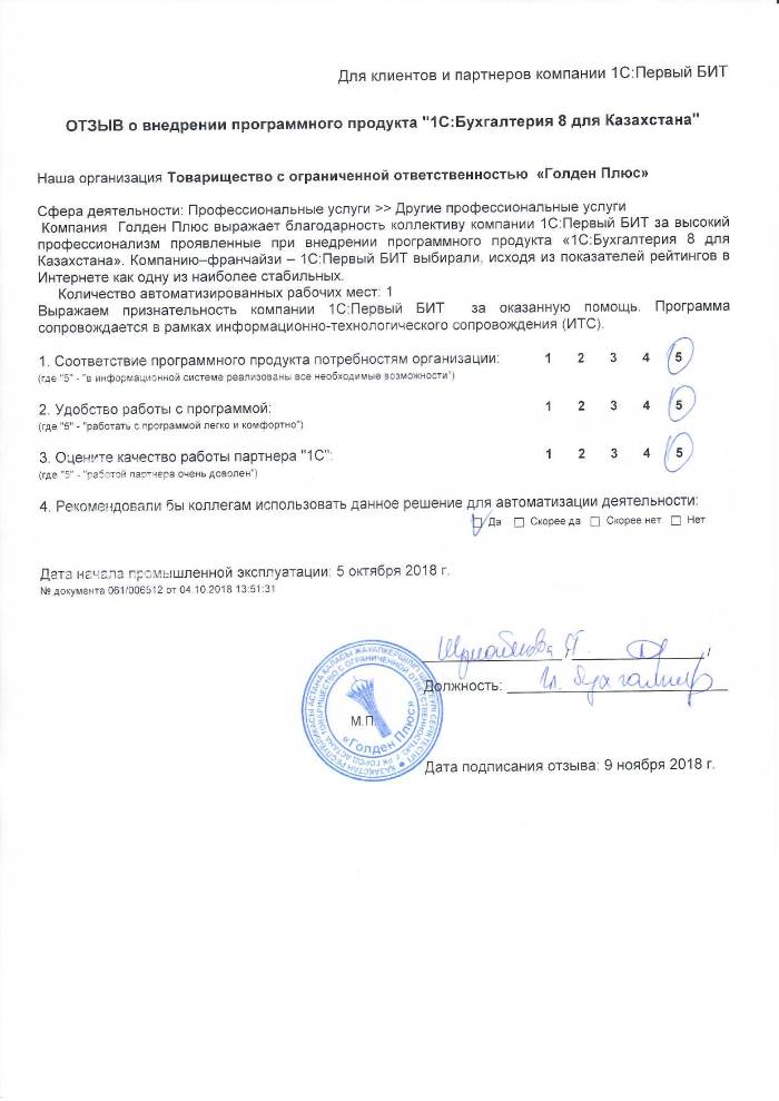 Внедренное решение: Автоматизация бухгалтерского учета на базе программного продукта "1С:Бухгалтерия 8 для Казахстана" в ТОО «Голден Плюс»