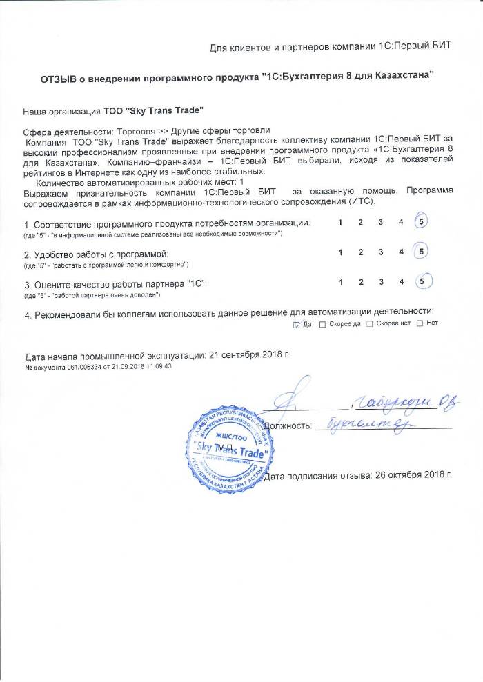 Внедренное решение: Автоматизация бухгалтерского учета на базе программного продукта "1С:Бухгалтерия 8 для Казахстана" в ТОО "Sky Trans Trade"
