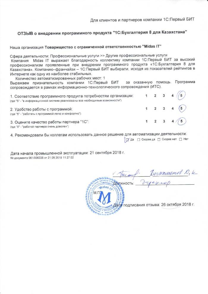 Внедренное решение: Автоматизация бухгалтерского учета на базе программного продукта "1С:Бухгалтерия 8 для Казахстана" в ТОО "Midas IT"