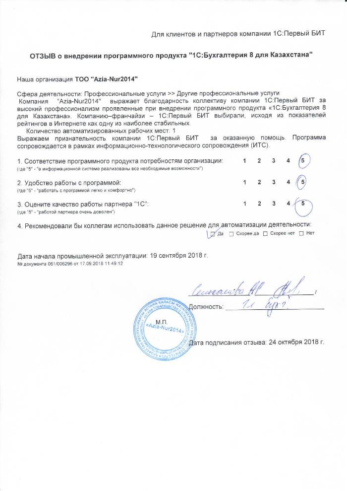 Внедренное решение: Автоматизация бухгалтерского учета на базе программного продукта "1С:Бухгалтерия 8 для Казахстана" комплект на 5 пользователей в ТОО "Azia-Nur2014"