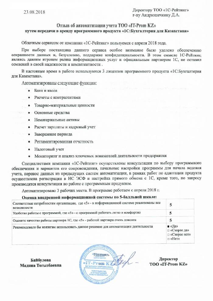 Внедренное решение: Автоматизация учета ТОО "IT-Prom KZ" путем передачи в аренду программного продукта "1С:Бухглтерия 8 для Казахстана"