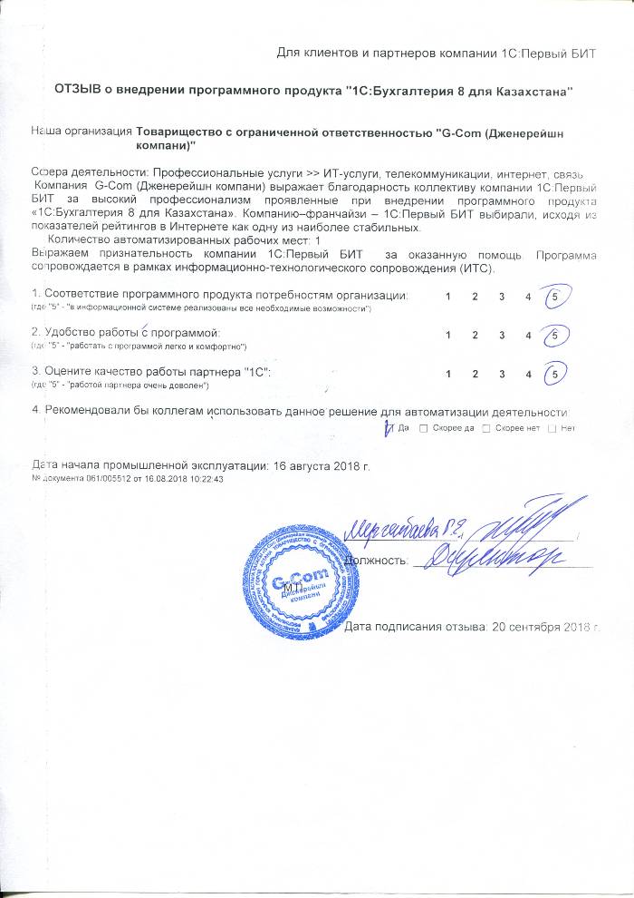 Внедренное решение: Автоматизация бухгалтерского учета на базе программного продукта "1С:Бухгалтерия 8 для Казахстана" в ТОО "G-Com (Дженерейшн компани)"