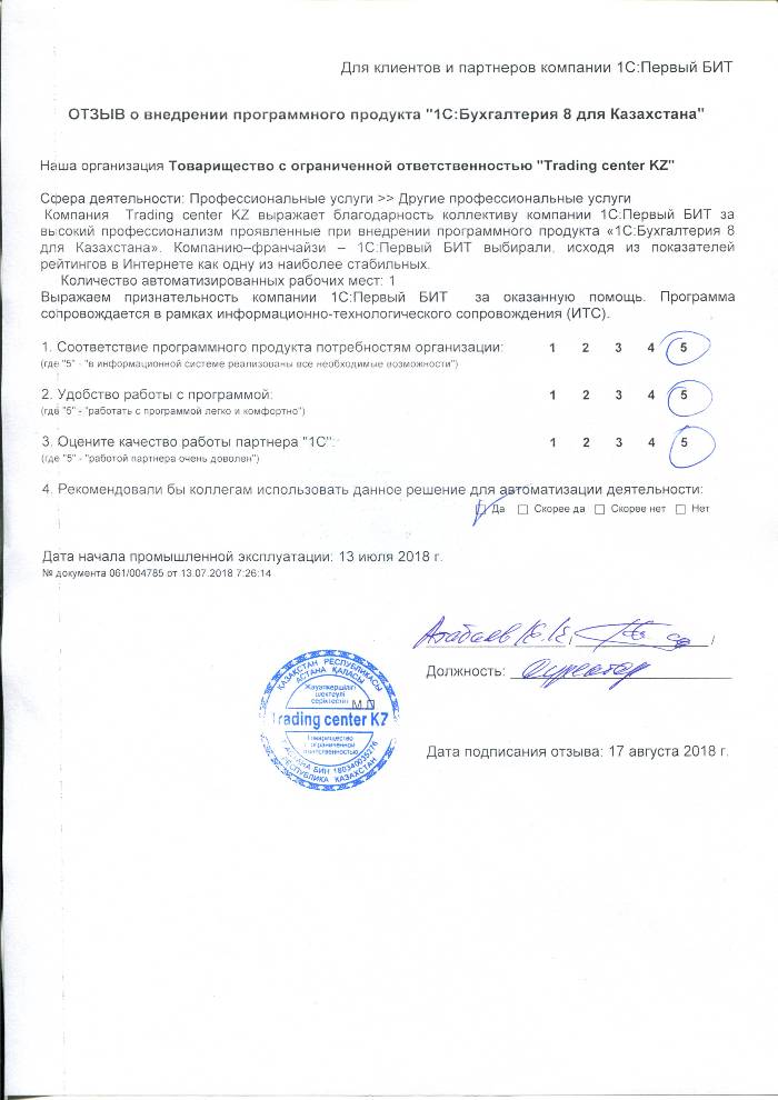 Внедренное решение: Автоматизация бухгалтерского учета на базе программного продукта "1С:Бухгалтерия 8 для Казахстана" в ТОО "Trading center KZ"