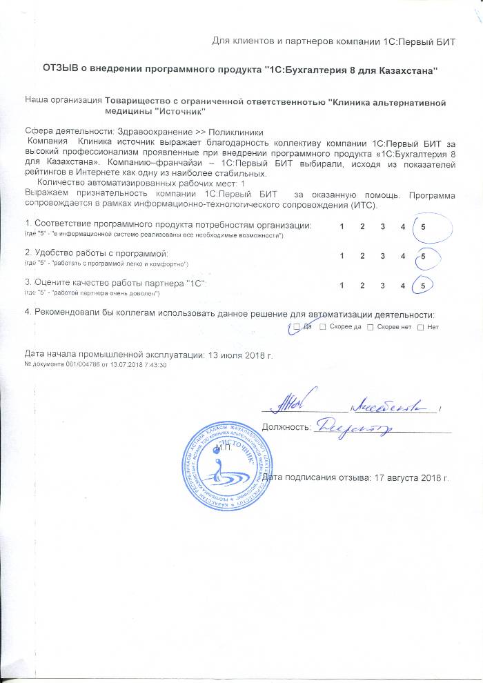 Внедренное решение: Автоматизация бухгалтерского учета на базе программного продукта "1С:Бухгалтерия 8 для Казахстана" в ТОО "Клиника альтернативной медицины "Источник"