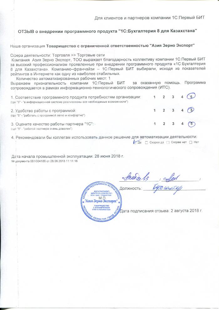 Внедренное решение: Автоматизация бухгалтерского учета на базе программного продукта "1С:Бухгалтерия 8 для Казахстана" в ТОО "Азия Зерно Экспорт"