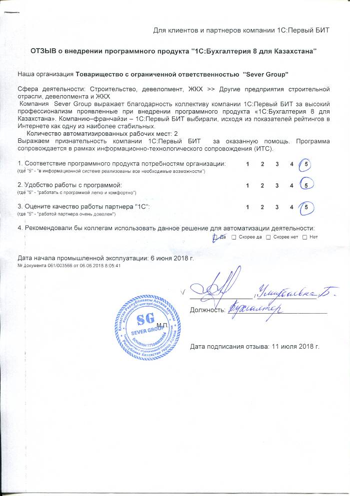 Внедренное решение: Автоматизация бухгалтерского учета на базе программного продукта "1С:Бухгалтерия 8 для Казахстана" в ТОО "Sever Group"