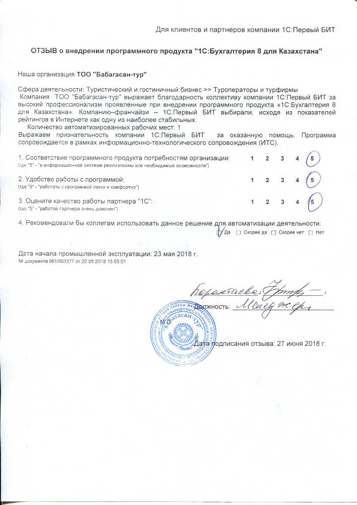 Внедренное решение: Автоматизация бухгалтерского учета на базе программного продукта "1С:Бухгалтерия 8 для Казахстана" в ТОО "Бабагасан-тур"