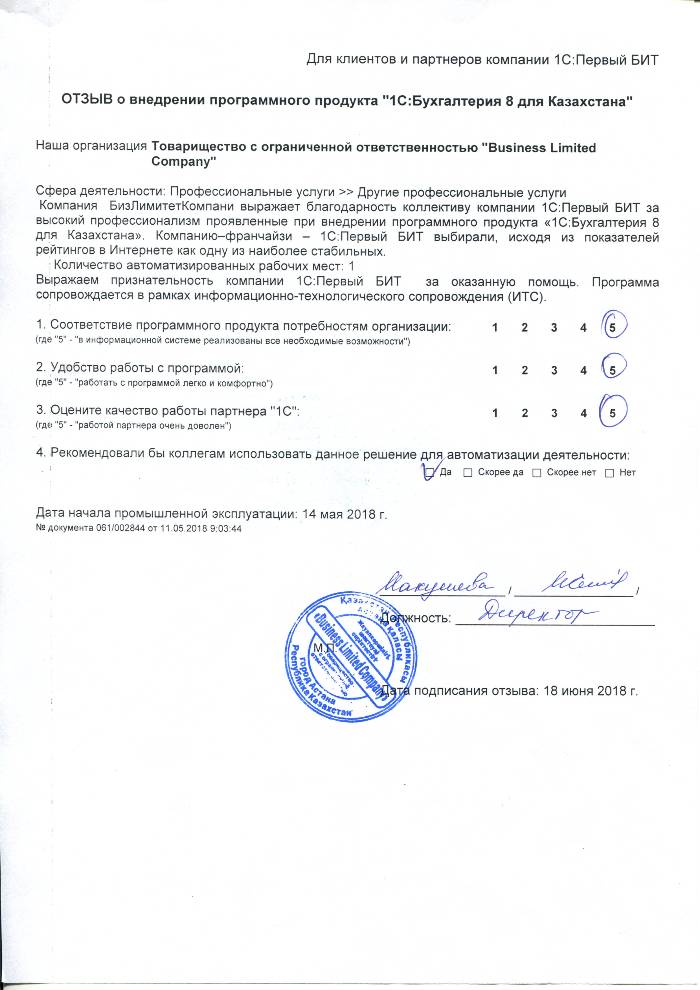Внедренное решение: Автоматизация бухгалтерского учета на базе программного продукта "1С:Бухгалтерия 8 для Казахстана" в ТОО "Business Limited Company"