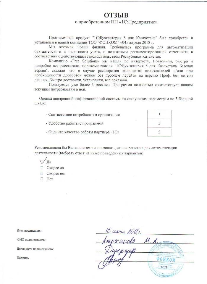 Оценка качества работы партнера "1С": 5