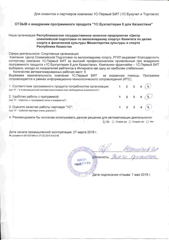 Внедренное решение: Автоматизация бухгалтерского учета на базе программного продукта "1С:Бухгалтерия 8 для Казахстана" комплект на 5 пользователей в РГКП «Центр олимпийской подготовки по велосипедному спорту»