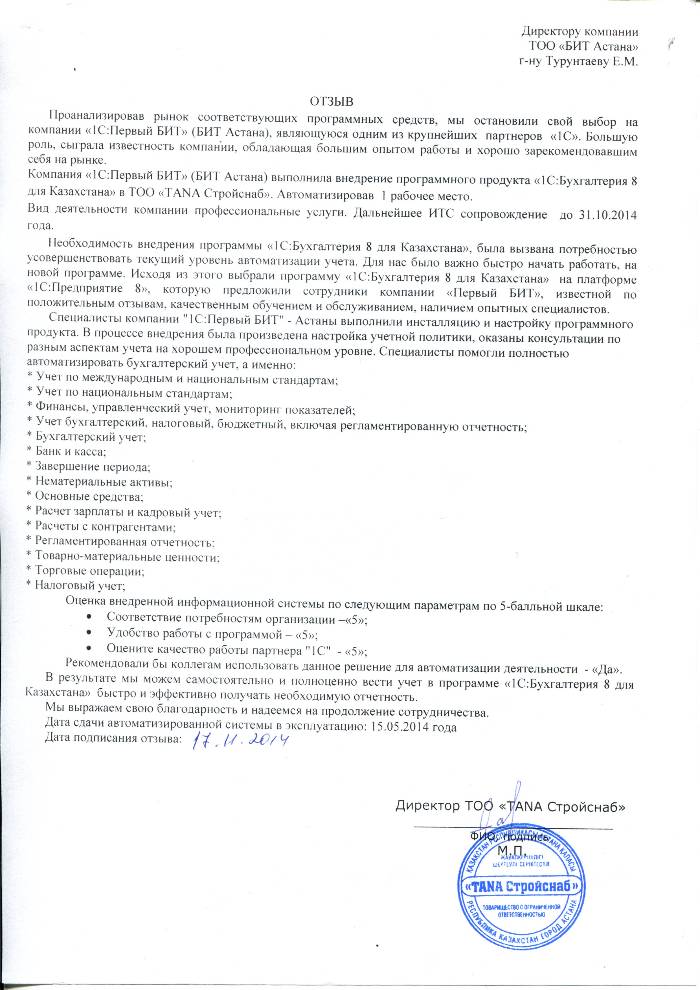Внедренное решение: Автоматизация бухгалтерского учета в ТОО "TANA Стройснаб" на базе программного продукта "1С:Бухгалтерия 8 для Казахстана"