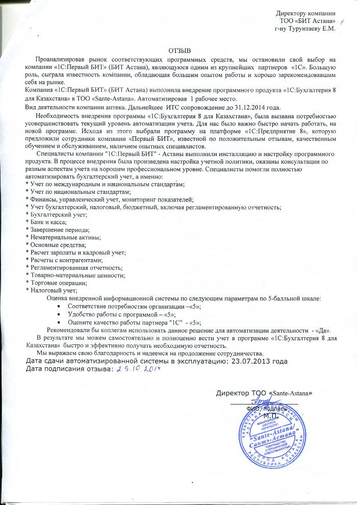 Внедренное решение: Автоматизация бухгалтерского учета в ТОО"Sante-Astana" на базе программного продукта "1С:Бухгалтерия 8 для Казахстана"
