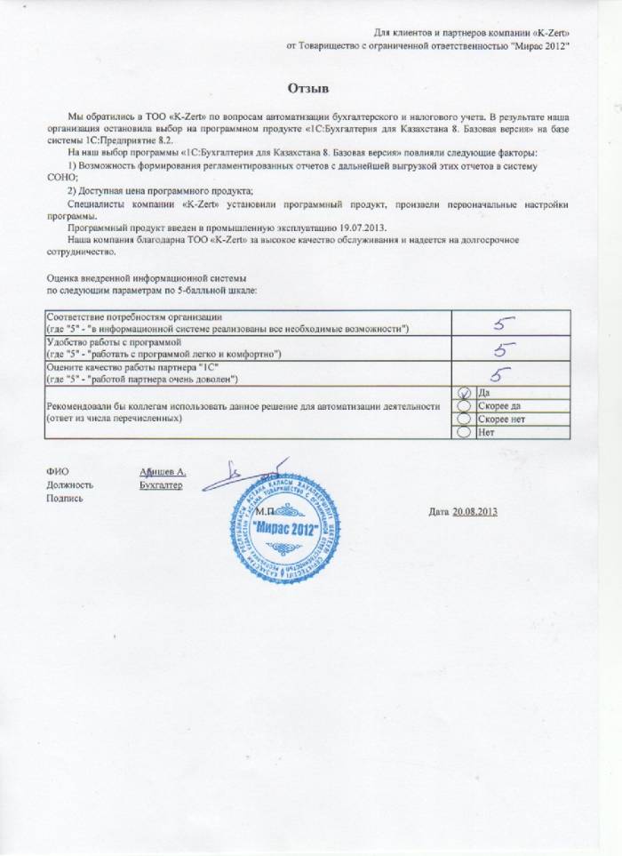 Внедренное решение: ТОО "Мирас 2012" автоматизировала бухгалтерский и налоговый учёт на базе ПП "1С:Бухгалтерия 8 для Казахстана. Базовая версия"