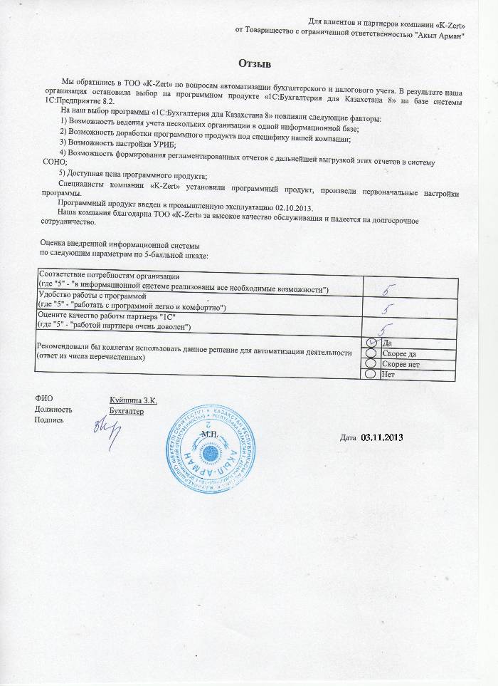 Внедренное решение: ТОО «Акыл-Арман» автоматизировал бухгалтерский и налоговый учёт на базе ПП "1С:Бухгалтерия 8 для Казахстана"