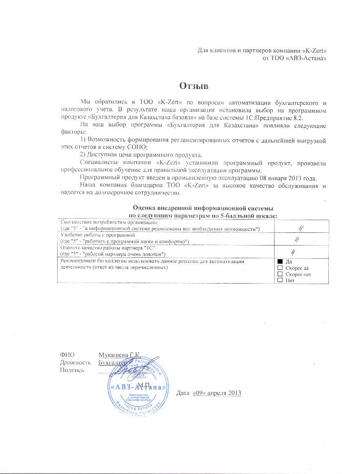 Внедренное решение: ТОО "АВЗ-Астана" автоматизировал бухгалтерский и налоговый учёт на базе ПП "1С:Бухгалтерия 8 для Казахстана. Базовая версия"