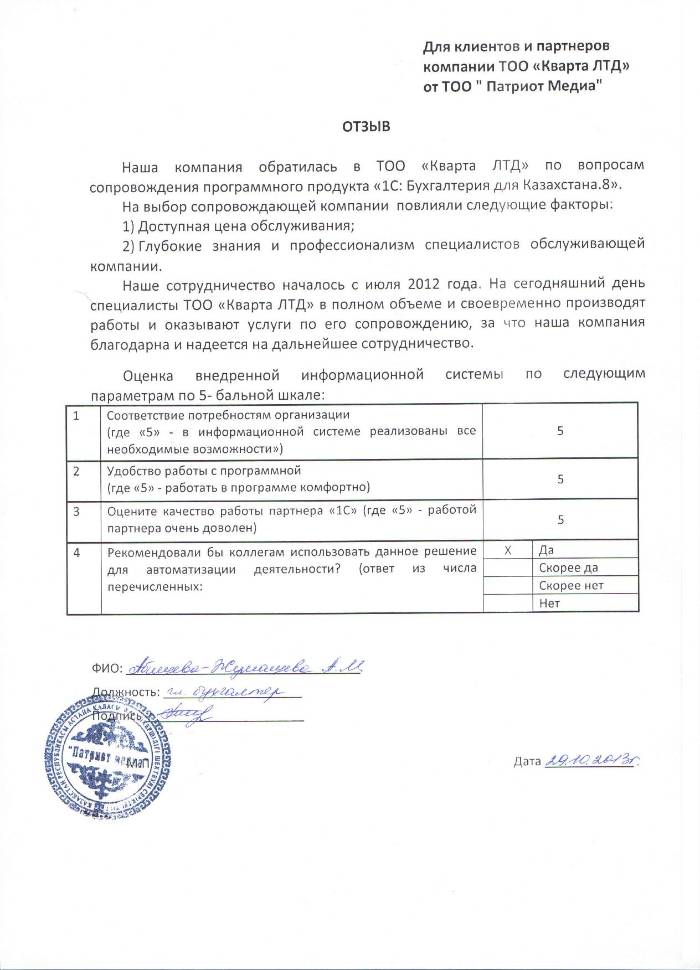 Клиент: ТОО Патриот Медиа