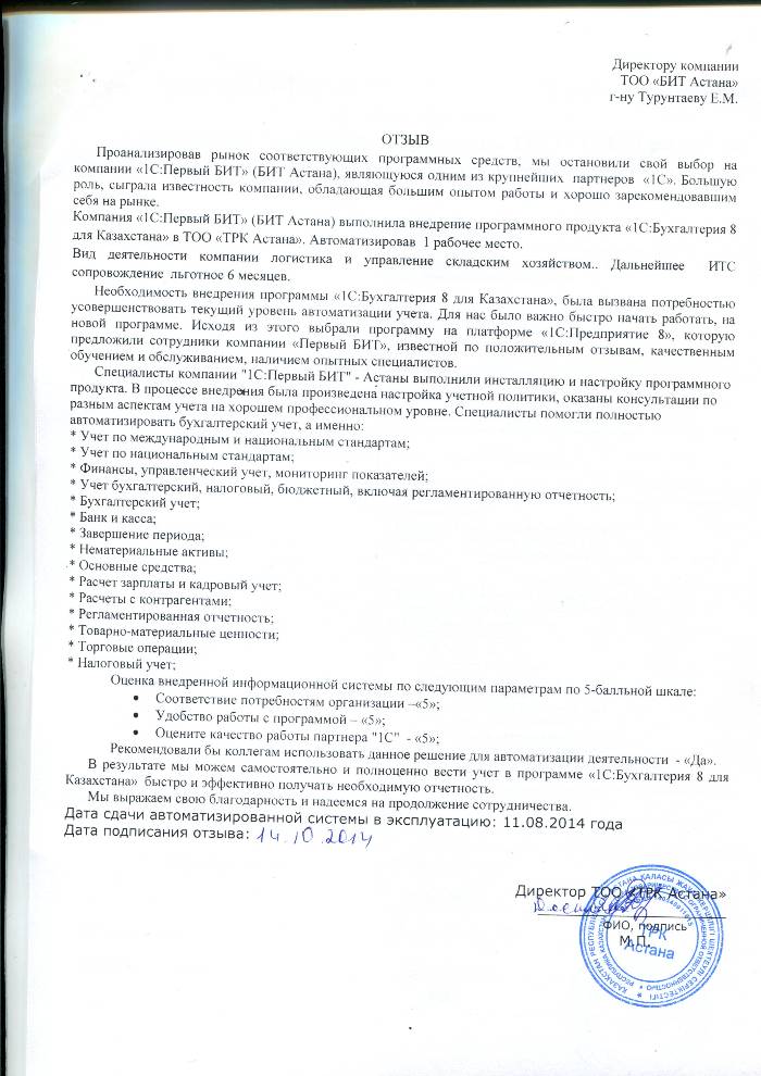 Внедренное решение: Автоматизация бухгалтерского учета в ТОО "ТРК Астана" на базе программного продукта "1С:Бухгалтерия 8 для Казахстана"