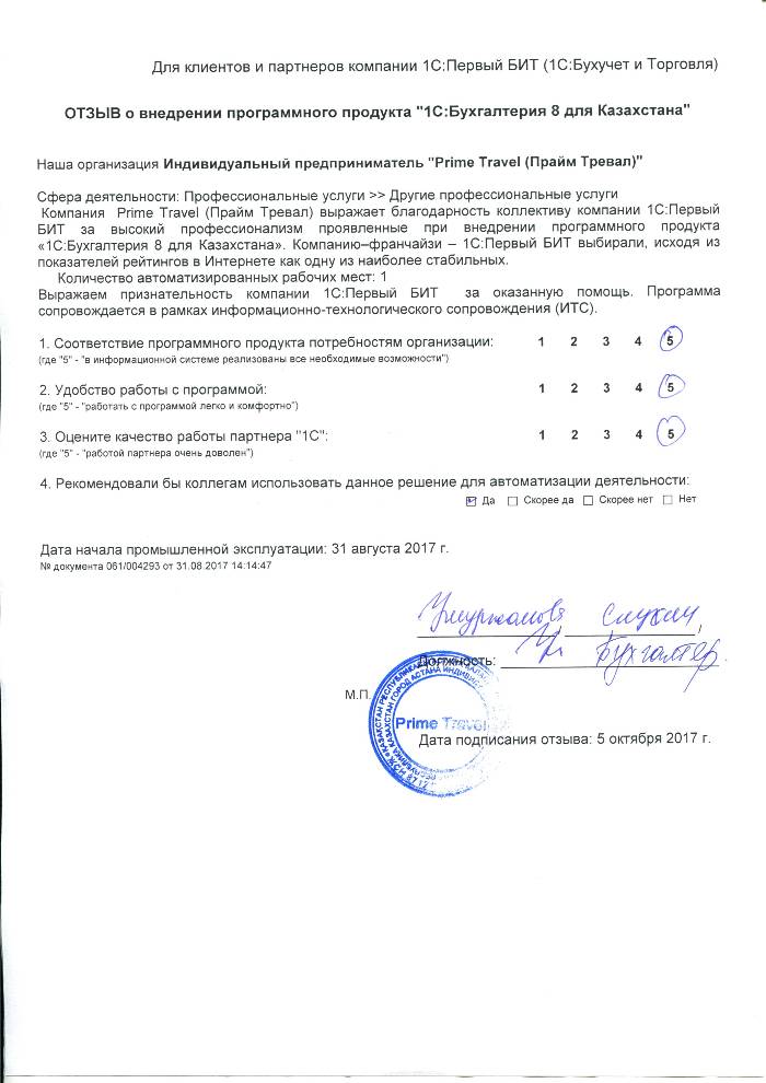 Внедренное решение: Автоматизация бухгалтерского учета на базе программного продукта "1С:Бухгалтерия 8 для Казахстана" у ИП "Prime Travel (Прайм Тревал)"