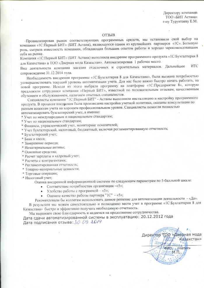 Внедренное решение: Автоматизация бухгалтерского учета в ТОО " Дверная мода Казахстана" на базе программного продукта "1С:Бухгалтерия 8 для Казахстана"