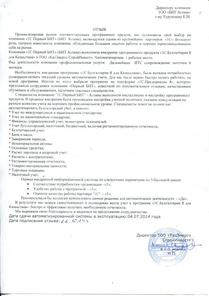 Внедренное решение: Автоматизация бухгалтерского учета в ТОО "КазЭнерго Строй-Инвест" на базе программного продукта "1С:Бухгалтерия 8 для Казахстана"
