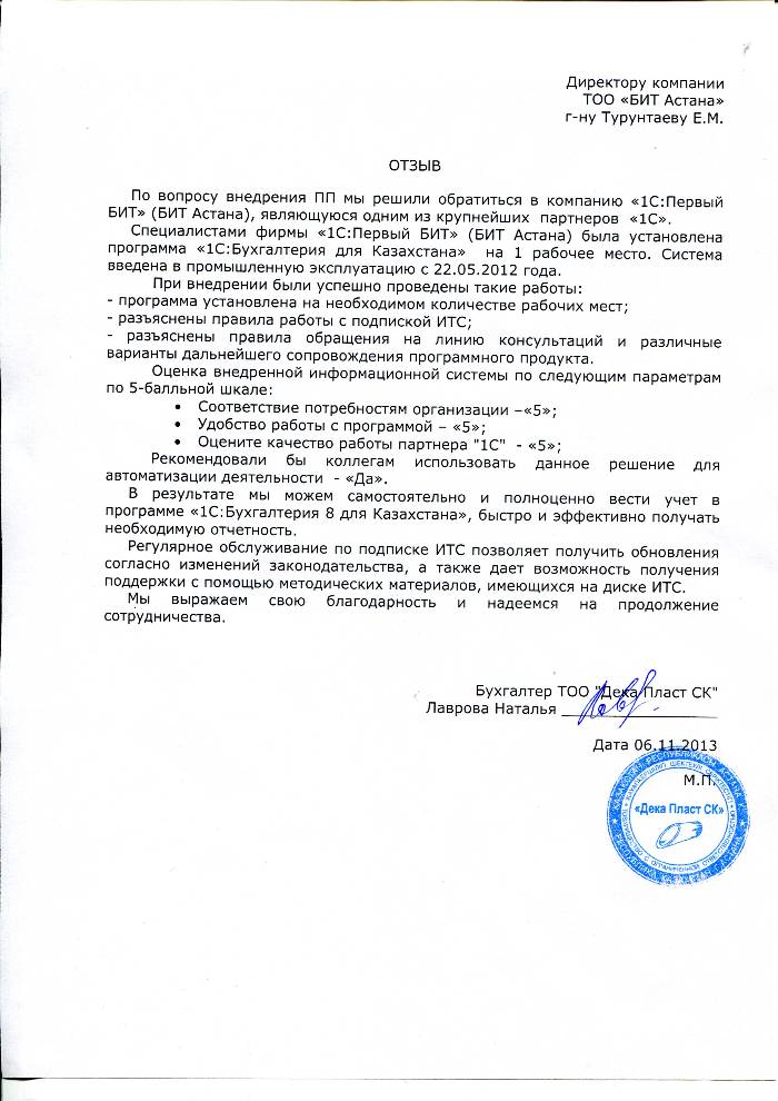 Внедренное решение: Автоматизация бухгалтерского учета в ТОО "Дека Пласт СК" на базе программного продукта "1С:Бухгалтерия 8 для Казахстана"