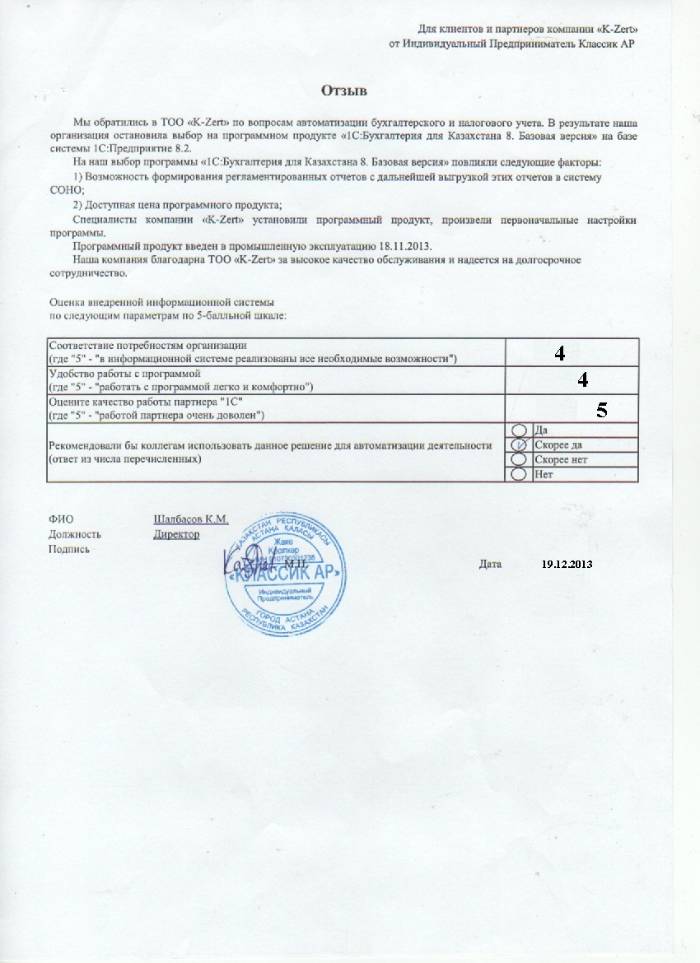 Внедренное решение: ИП "Классик АР" автоматизировал бухгалтерский и налоговый учёт на базе ПП "1С:Бухгалтерия 8 для Казахстана. Базовая версия"