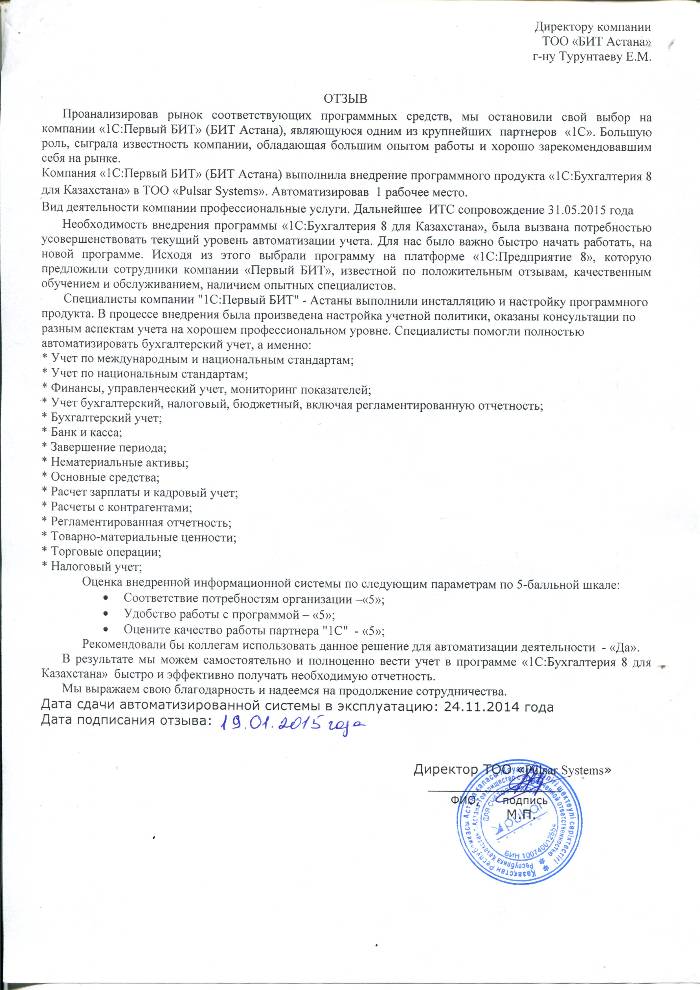 Внедренное решение: Автоматизация бухгалтерского учета в ТОО "Pulsar Systems" на базе программного продукта "1С:Бухгалтерия 8 для Казахстана"