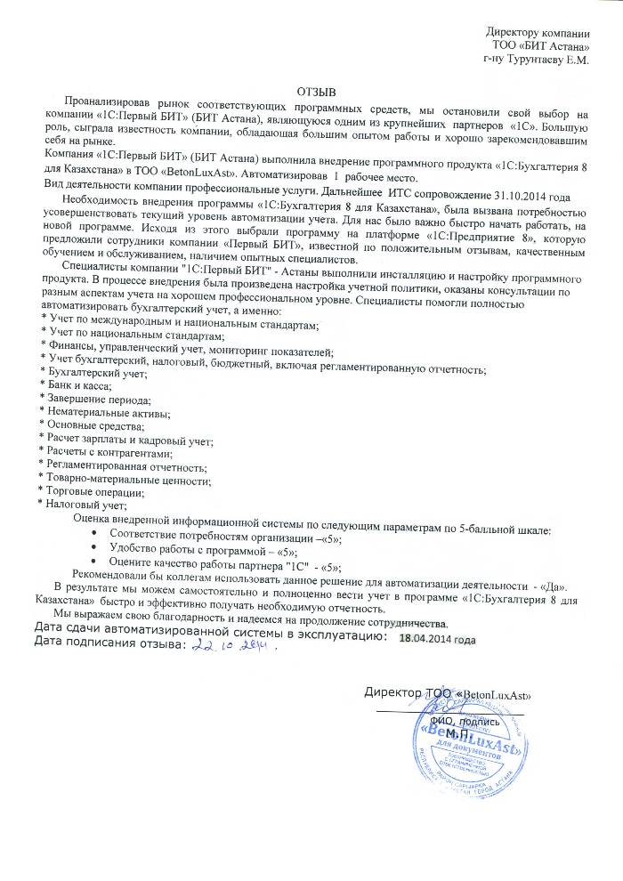 Внедренное решение: Автоматизация бухгалтерского учета в ТОО "BetonLuxAst" на базе программного продукта "1С:Предприятие 8. Бухгалтерия для Казахстана"