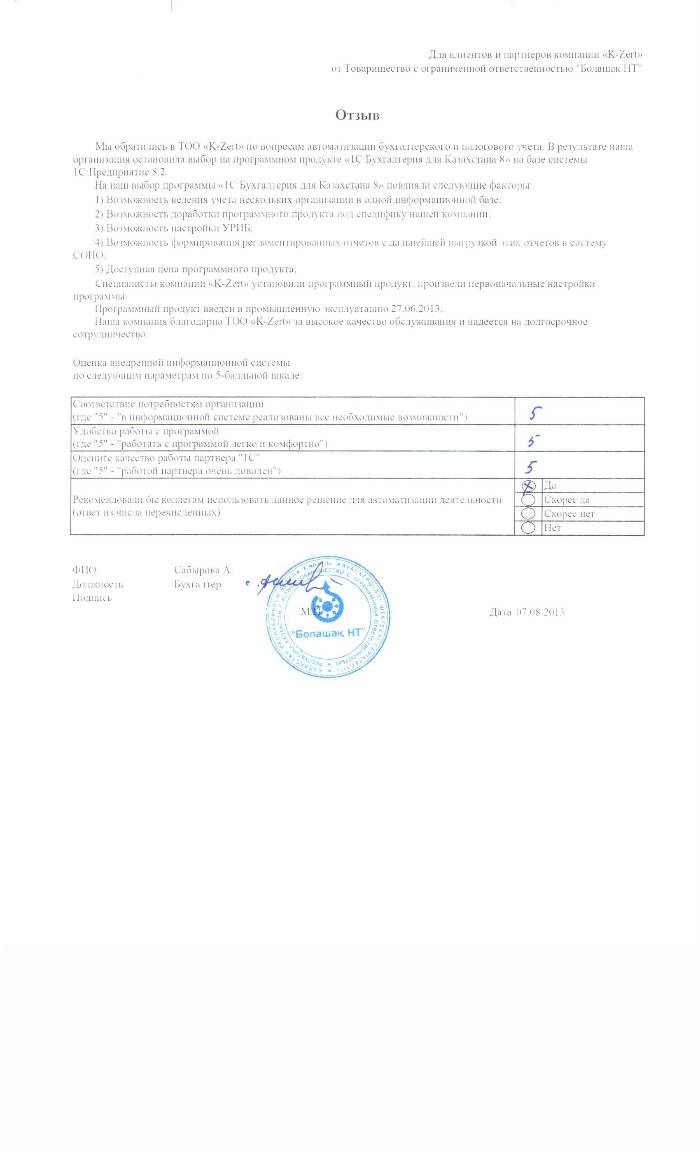 Внедренное решение: ТОО «Болашак НТ» автоматизировал бухгалтерский и налоговый учёт на базе ПП "1С:Бухгалтерия 8 для Казахстана"