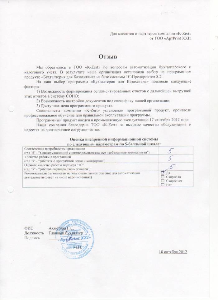 Внедренное решение: ТОО «АртPrint XXI» автоматизировал бухгалтерский и налоговый учёт на базе ПП "1С:Бухгалтерия 8 для Казахстана"