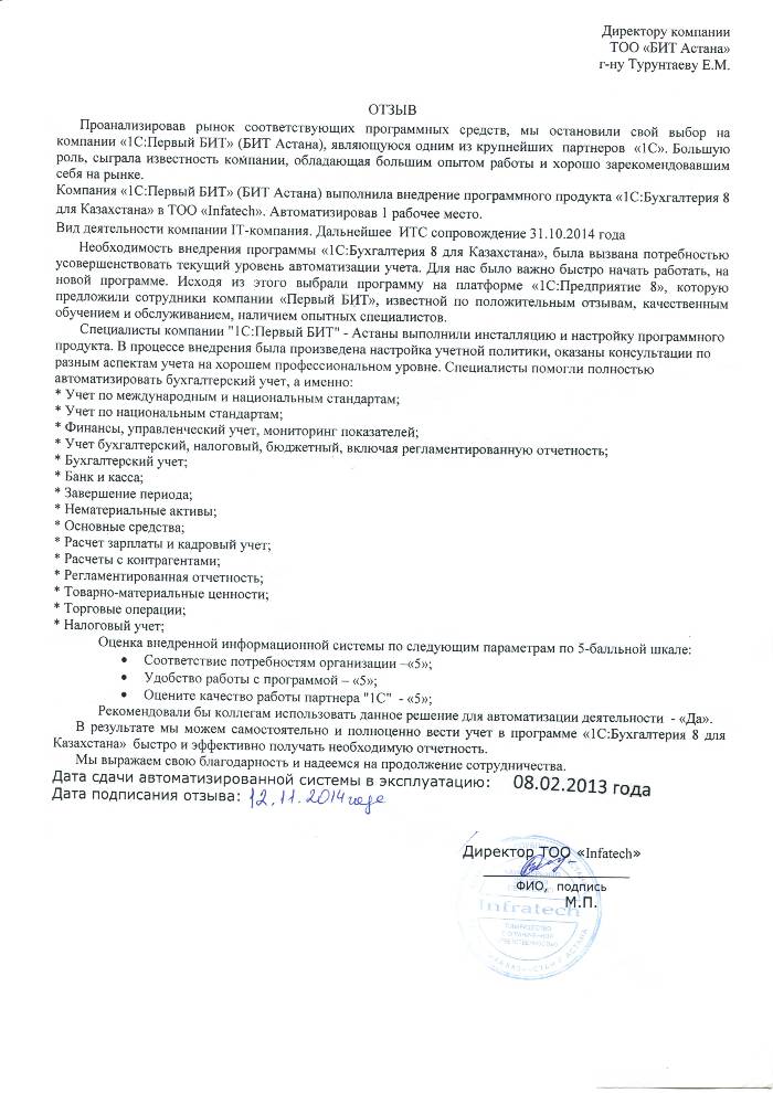 Внедренное решение: Автоматизация бухгалтерского учета в ТОО "Infratech" на базе программного продукта "1С:Предприятие 8.Бухгалтерия для Казахстана"