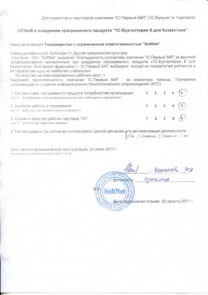 Внедренное решение: Автоматизация бухгалтерского учета на базе программного продукта "1С:Бухгалтерия 8 для Казахстана" в ТОО "SoftNet"