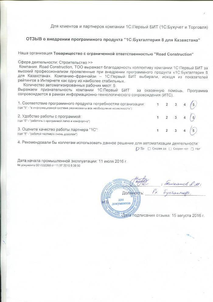 Внедренное решение: Автоматизация бухгалтерского учета на базе программного продукта "1С:Бухгалтерия 8 для Казахстана" в ТОО "Road Construction"