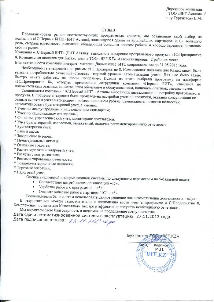 Внедренное решение: Автоматизация бухгалтерского и оперативно-складского учета в ТОО "BFF.KZ" на базе программного продукта "1С:Предприятие 8. Комплексная поставка для Казахстана"