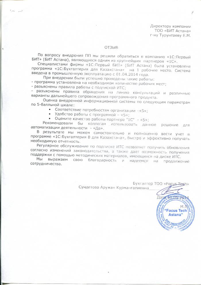 Внедренное решение: Автоматизация бухгалтерского учета в ТОО "Focus Tech" на базе программного продукта "1С:Предприятие 8. Комплексная поставка для Казахстана"