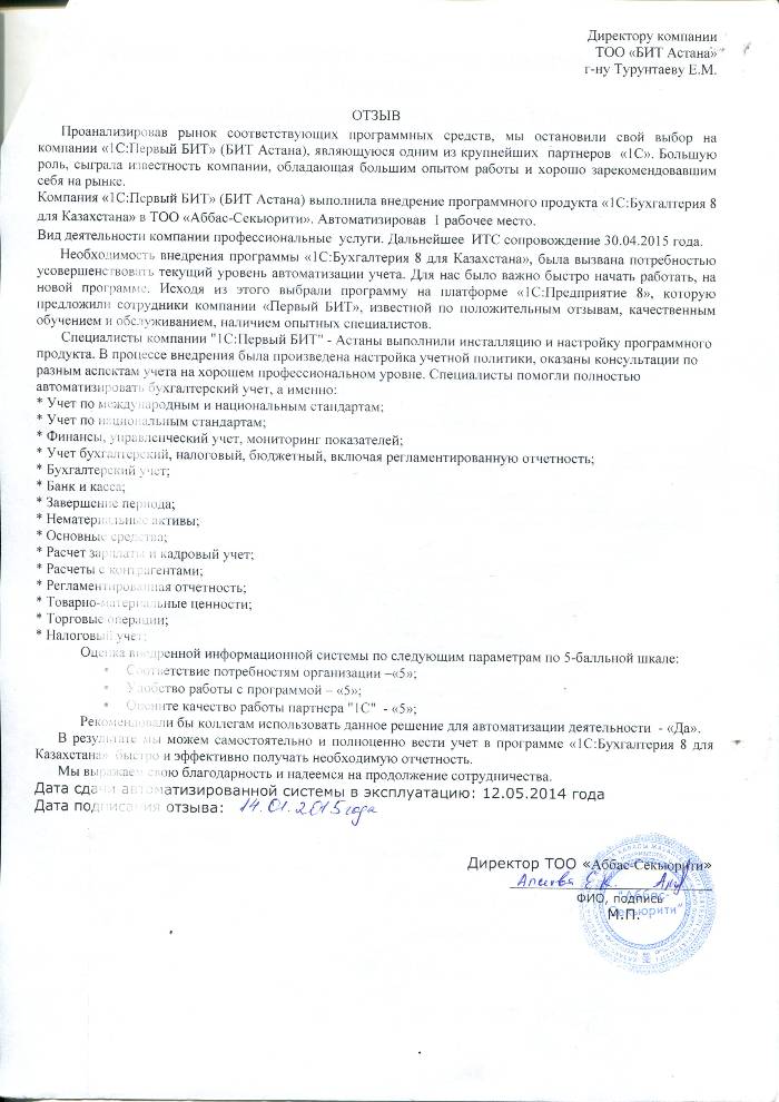 Внедренное решение: Автоматизация бухгалтерского учета в ТОО «Аббас-Секьюрити» на базе программного продукта "1С:Бухгалтерия 8 для Казахстана"