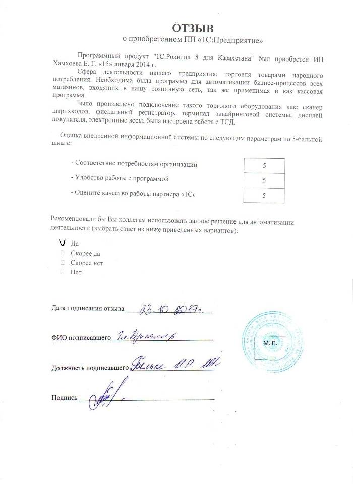 Отзыв клиента на внедренное решение