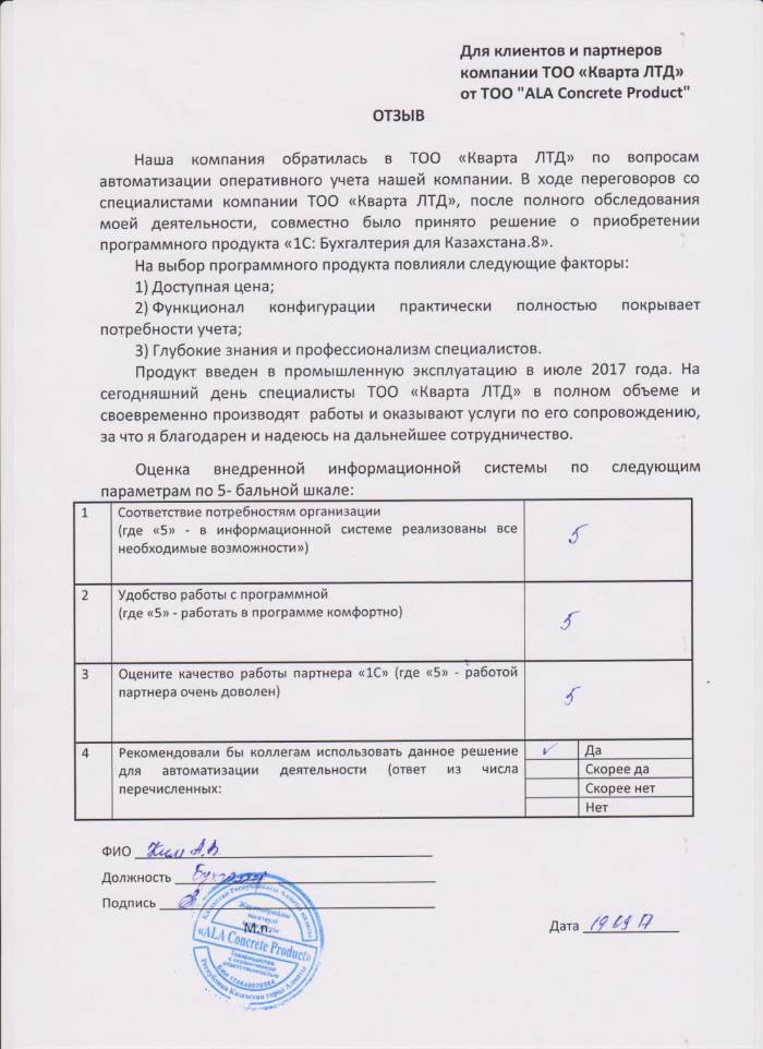 Клиент: Товарищество с ограниченной ответственностью "ALA Concrete Product"
