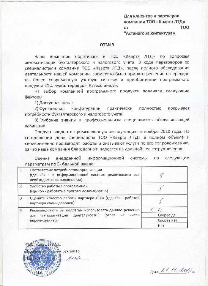 Отзыв клиента на внедренное решение